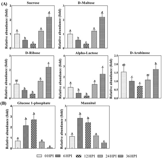 A more detailed analysis of changes in the levels of carbohydrates in S2 cells is presented in Figure 5. Carbohydrates such as sucrose, arabinose, ribose, maltose and alpha-lactose declined during the early infection stages before increasing again at the pathogenic stage. On the other hand, levels of mannitol/glucitol and glucose-1-phosphate were highest at the 6 HPI and 12 HPI stages (Figure 5; Table S1).
