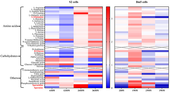 Comparison of relative abundances of metabolites after infection of S2 and Bm5 cells with CrPV. Intensities reflect relative decrease (in blue) or increase (in red) of the metabolite with respect to uninfected cells (average of N = 5). The different pattern of amino acids and carbohydrates in S2 cells (down-up) and Bm5 cells (up-down) is clearly apparent. Red colored are glutamine and glucose that show a characteristic increase at the end of infection with the S2 cells, while there was an opposite effect with a clear unique decline in Bm5 cells. Spermine and spermidine that show a dynamic pattern in both types of infections are also indicated.