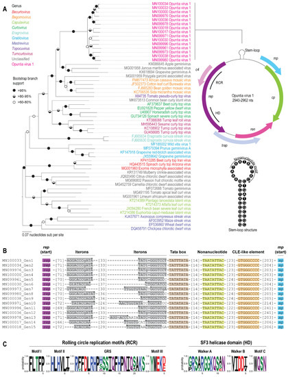 (A). Neighbor-Joining phylogenetic tree of the full-length genome of representatives of the 15 genotypes of OpV1 with those of the family Geminiviridae. Branches with < 60% bootstrap support are collapsed, and the tree is midpoint-rooted. The genomic organization of OpV1 and the stem–loop structure containing the nonanucleotide motif are shown to the right of the phylogenetic tree. (B). Nucleotide sequence and organization of origin of replication-associated iterative sequences “iterons” in the intergenic region. Arrows indicate the orientation of the iterons with respect to the nonanucleotide sequence. Lower-case letters in an iterated element indicate a nucleotide that does not match in all the iterons from OpV1 viruses of that same genotype. The TATA box, nonanucleotide motif and conserved late element (CLE)-like sequence. (C). Graphic representation of the variation in amino acids in the motifs from the SF3 helicase domains and the rolling circle replication motifs present in the Rep sequences of the 79 OpV1s.
