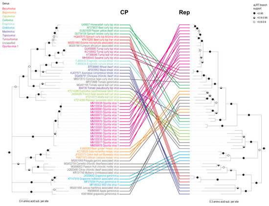 Datasets were also constructed that contained either the inferred Rep or inferred CP amino acid sequences of one, representative of each of the 15 OpV1genotype groups, along with representative sequences of viruses in the nine established geminivirus genera (30 viruses) and sequences from geminiviruses that remain unassigned to any genus (12 viruses). These Rep and CP amino acid datasets were aligned by MAFFT v.7 [62]. The alignments were used to infer ML phylogenetic trees using PHYML 3.0 [64] with the amino acid substitution models rtRev+G+F+I used for the CP dataset and rtRev+Γ+F+I used for the Rep dataset (these models were determined as best fitting by ProtTest; [66]), using the approximate likelihood ratio test (aLRT) of branch support. Branches with < 0.8 aLRT support were collapsed with TreeGraph2 [63] and both ML trees were rooted with sequences of viruses from the family Genomoviridae.