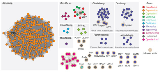 Sequence similarity network analysis of the CP amino acid sequences of representatives of the 15 genotypes from OpV1, together with those of the geminiviruses present in GenBank (dataset was created with an amino acid identity cut-off of 90%). The clusters are colored based on the genus or group. The genera that have known insect vectors are highlighted in a light grey box with the insect vector name displayed in the top. Clusters or singletons marked with a brown halo have no known insect vector associated with them. ACSV, Axonopus compressus streak virus; CaCDaV, Camellia chlorotic dwarf-associated virus; CCDaV, Camellia citrus chlorotic dwarf-associated virus; DfasMV, dragonfly-associated mastrevirus; CBCSV, common bean curly stunt virus; ECSV, Eragrostis curvula streak virus; EMSV, Eragrostis minor streak virus; GraGV, grapevine geminivirus; JmaV, Juncus maritimus-associated virus; LaaV, Limeum africanum-associated virus; MCaV, mulberry crinkle- associated virus; MiSV, Miscanthus streak virus; MSMV, maize streak Reunion virus; PCMoV, passion fruit chlorotic mottle virus; PgaV, Polygala garcinii-associated virus; RLV1, rice latent virus 1; RLV2, rice latent virus 2; SMaV, switchgrass mosaic-associated virus; SpSMV1, sweetpotato symptomless mastrevirus 1; SSMV1, Sporobolus striate mosaic virus 1; SSMV2, Sporobolus striate mosaic virus 2; SStV-A, sugarcane striate virus A; SStV-D, sugarcane striate virus D; SWSV, sugarcane white streak virus; TaGV, tomato-associated geminivirus; ToALCV, tomato apical leaf curl virus.