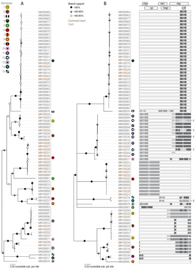(A). Neighbor-Joining phylogenetic tree of the 79 OpV1 genomes recovered in this study. Branches with <60% bootstrap support are collapsed. (B). Maximum Likelihood phylogenetic tree of the 79 OpV1 genomes with recombination regions removed. For each genome, a graphic on the right indicates the recombination event with its breakpoint location within the genome. Branches with <60% bootstrap support are collapsed. The 15 genotypes are marked with symbols and genomes that have been recovered from plants (accession numbers in grey) and cochineal insects (accession numbers in brown) are indicated.