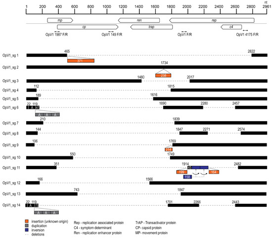 Only three of the 14 sub-genomic molecules (OpV1 sg 2, -5, and -12) have an intact Rep coding region and only two have an intact CP coding region (OpV1 sg 2 and -3).