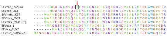 - Nandakumar, S.; Bae, E.H.; Khan, A.S. Complete genome sequence of a naturally occurring simian foamy virus isolate from rhesus macaque (sfvmmu_k3t). Genome Announc. 2017, 5, e00827-17. [Google Scholar] [CrossRef] [PubMed]