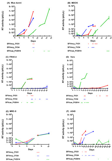 - Clarke, J.K.; Samuels, J.; Dermott, E.; Gay, F.W. Carrier cultures of simian foamy virus. J. Virol. 1970, 5, 624–631. [Google Scholar] [CrossRef] [PubMed]