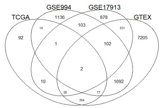Venn diagram of genes correlated with ACE2 expression levels in four different datasets (The Cancer Genome Atlas (TCGA), GSE994, GSE17913 and Genotype-Tissue Expression (GTEx)). Ninety-four genes are reported by TCGA-LUAD and GSE994, 39 genes between TCGA-LUAD and GSE17913 and 409 common genes between TCGA-LUAD and GTEx.