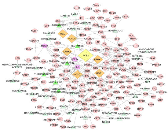 The figure shows the relationships between correlated genes (pink ellipse) with ACE2 (yellow diamond) and known drugs (green triangle) in a protein-protein interaction network. Top genes correlated with ACE2 are represented with orange diamond. Dark green triangles indicate the drugs associated with the genes with a high degree centrality (purple ellipse).