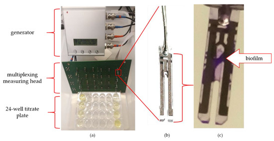 - Paredes, J.; Becerro, S.; Arizti, F.; Aguinaga, A.; Del Pozo, J.L.; Arana, S. Interdigitated microelectrode biosensor for bacterial biofilm growth monitoring by impedance spectroscopy technique in 96-well microtiter plates. Sens. Actuators B Chem. 2013, 178, 663–670. [Google Scholar] [CrossRef]