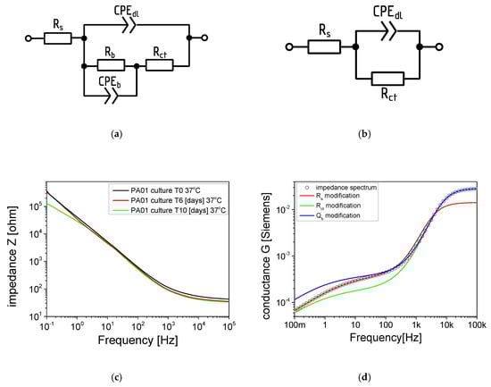 Primary (a) and simplified (b) electric equivalent circuits (EECs) used for the analysis of measured impedance spectra; (c) impedance spectra of quartz tuning forks (QTF) in P. aeruginosa PAO1 10-days biofilm culture, and the influence of EEC parameters change to the shape of conductance spectrum (d).