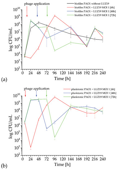 The dynamics of PAO1 biofilm growth on quartz surface was determined by a standard colony count for both phage treated and untreated culture (Figure 3). The phage LUZ19 at MOI = 1 was applied at three different culture times (marked with colored arrows in Figure 3), corresponding to the 6th, 48th and 72nd h of incubation. Cell counts were measured starting from 6 h until 10 days of incubation. In the untreated biofilm experiment, an increase in the number of cells is observed, with a maximum of about 108 CFU/mL for 48 h incubation (black curve in Figure 3a). Further incubation gradually reduces the population up to around 106 CFU/mL on the tenth day of the experiment. Phage application at the 6th h inhibited the propagation of sessile cells for one day, and further, the biofilm population started growing up to the maximum of 109 CFU/mL after four days of incubation (red curve in Figure 3a). The application of phage LUZ19 at MOI = 1 at 48 and 72 h (blue and green curves in Figure 3a) caused a decrease in the number of sessile cells at the level of 2–3 logs followed by the population regrowth and a final count of around 106 CFU/mL. The permanent exposition of biofilm to phage infection resulted in the fluctuation of the cell number embedded in biofilm matrix from 109–108 CFU/mL to 105 CFU/mL. Prolonged biofilm cultures infected with phage LUZ19 stabilized the colony count at around 106 CFU/mL after 10 days of incubation regardless of the time point of phage infection.