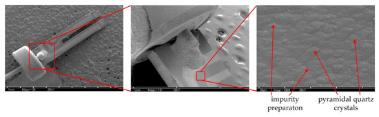 To confirm the presence of biofilm formation on the surface of the QTF sensor, we performed the analysis using a scanning electron microscope (SEM). As part of the control experiment, the sensors were suspended in TSB broth without bacteria (Figure 4). Microscopic images show the structure of the sensor surface. It consists of evenly distributed quartz crystals making a pyramidal form. Bright elements appearing are not bacterial cells but likely derive from diluents or result from post-production sensor impurities.