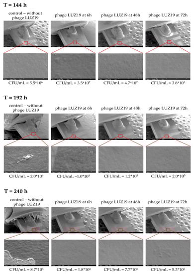 Visualization of QTF sensors at the 144th, 192nd, and 240th h of untreated and phage LUZ19 treated biofilm at MOI = 1 (from left to right, added at the 6th, 48th and 72nd h of culture, respectively). The upper panel shows the tuning fork ring at 30× magnification. The bottom panel enlarged 3000× QTF surface. The bottom panel presents the CFU/mL values corresponding to selected time point.