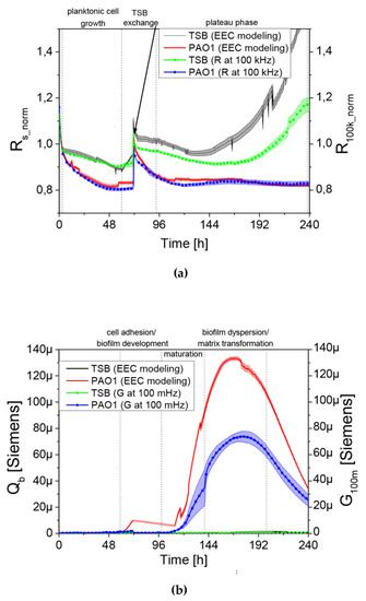 The standardization of a real-time monitoring of P. aeruginosa PAO1 biofilm growth using QTF impedance spectroscopy was performed (Figure 6). The initial drop of resistance R100k was caused by the temperature stabilization of growth medium.
