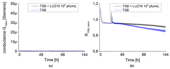 The changes in conductance G100m (left panel) and resistance R100k_norm (right panel) measured by QTF sensors for negative control consisted of phage LUZ19 and TSB medium. Data are expressed as mean conductance G100m ± SD and R100k_norm of four independent experiments.