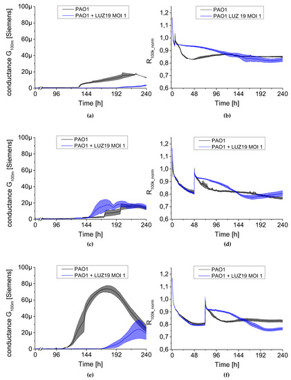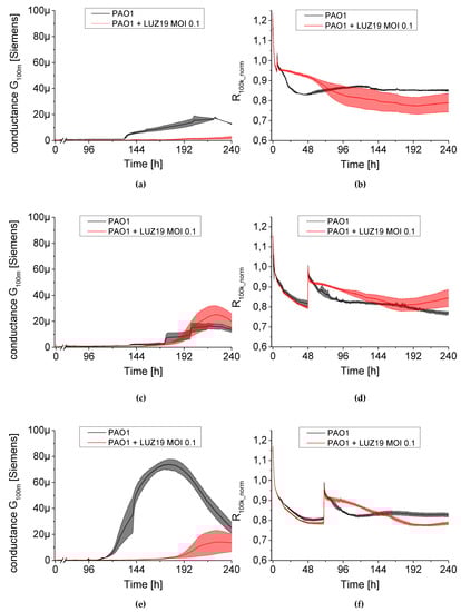 The changes in conductance G100m (left panel) and resistance R100k_norm (right panel) measured by QTF sensors during phage LUZ19 treatment of PAO1 biofilm at MOI = 0.1. Phage was applied at the 6th (a,b), 48th (c,d) and 72nd (e,f) hour of biofilm culture. In the right panel, for each variant, a peak appears, which is associated with the transfer of QTF sensors to new medium containing an appropriate concentration of viral particles. Data are expressed as mean of conductance G100m ± SD and resistance R100k_norm from three independent experiments.