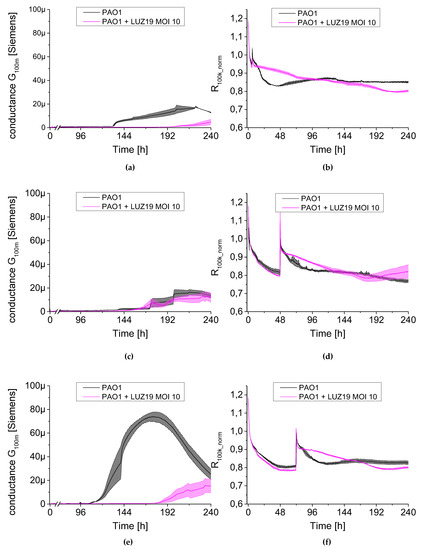When phage was administered at six h of culture incubation, a strong inhibition in biofilm growth was observed regardless of MOI applied (Figure 8a, Figure 9a and Figure 10a). The G100m parameter for PAO1 control began to increase at around 100 h into the experiment, reaching 20 μSiemens after 220 h, while the conductance of phage-infected culture was at 3–5 μSiemens up to 10 days into the experiment. The propagation of planktonic cells was slowed down when phage was applied at six h of culture incubation (Figure 8b, Figure 9b and Figure 10b). The resistance parameter (R100k_norm) made up the control culture at around the 60th and the 100th h of incubation for MOI 0.1 and MOI 1–10, respectively. Other results were obtained after LUZ19 application at 48 h of the culture. Biofilm was not sensitive to phage therapy regardless of applied phage concentration in the culture medium. The maximum conductance was observed around 220, 168 and 192 for MOI 0.1, 1 and 10, respectively, corresponding to the conductivity of around 20 μSiemens. The analysis of planktonic forms via serial resistance R100k_norm showed similar dynamics in generating phage-resistant forms regardless of MOI. The biofilm infection at 48 h after the start of the experiment generated similar cell regrowth regardless of applied LUZ19 concentrations, reaching a plateau phase by about the 144th h.