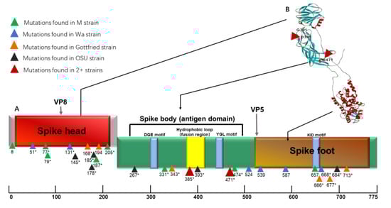 Structure of rotavirus VP4 spike protein. Linear schematic organization (A) and 3D structure (B) including VP8* and VP5* sub-units, spike head, spike body and spike foot are shown. Mutations localized in each domain are shown as triangles and numbers under these triangles denote amino acid position with asterisks indicating non-synonymous mutations. The 3D structure was generated by using online protein modeling tool Phyre2 [17].