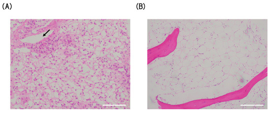 (A) Liver biopsy showed periportal zonal necrosis with macrovesicular steatosis compatible with the diagnosis of acute hepatitis (H-E (hematoxylin and eosin) staining, ×10). Arrow indicates portal vein. (B) Bone marrow biopsy showed decreased hematopoietic cells (hypocellular marrow), with increased adipose tissue consistent with the diagnosis of aplastic anemia (H-E staining, ×10). Scale bar, 500 µm.