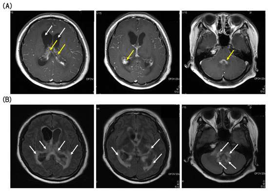 (A) T1-weighted (T1W) axial gadolinium-enhanced magnetic resonance imaging (MRI) showed Bilateral ventricle enlargement (white arrows), and hypertrophy choroid plexus (yellow arrows) with heterogeneous enhancement (axial sections). (B) Fluid-attenuated inversion recovery image (FLAIR) revealed high-intensity periventricular white-matter changes (white arrows) (axial sections).