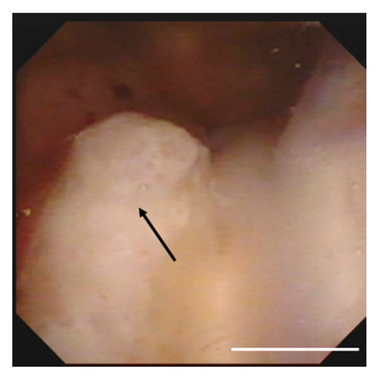 Operative findings showing a solid tumor (arrows) in the right lateral ventricle densely adherent to the choroid plexus. Scale bar, 1 cm.