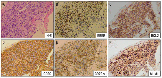 Tumor tissues were fixed in 10% buffered formalin and embedded in paraffin. Sections were cut to a thickness of 4 µm and stained with hematoxylin and eosin (H-E). Immunohistochemical stains were performed with a Ventana BenchMark XT automated staining instrument (Roche Tissue Diagnostics, Tokyo, Japan), according to the manufacturer’s protocol, with the following primary antibodies: anti-CD20 (L26, Roche Diagnostics K.K., Tokyo, Japan), anti-CD79a (JCB117, Nichirei, Tokyo, Japan), anti-BCL2 (124, Agilent Technologies, Santa Clara, CA, USA), and anti-MUM1 (mum1p, Agilent Technologies). In situ hybridization for Epstein–Barr virus-encoded small RNAs (EBER) was performed on FFPE (formalin-fixed paraffin-embedded)tissue section using a (FITC fluorescein isothiocyanate) labeled oligonucleotide probe (Roche Diagnostics K.K.) supplied by Ventana on an automated staining instrument (Ventana-Benchmark, Tucson, AZ, USA).