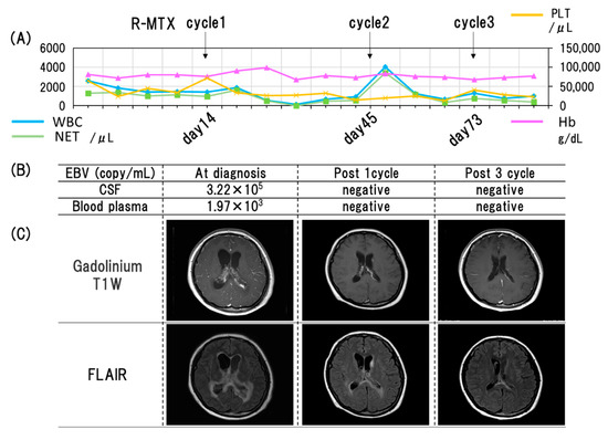 (A) The clinical course of this case. The X axis indicates the time (days). WBC (white blood cells), Hb (hemoglobin), PLT (platelets), NET (neutrophils), R (Rituximab), MTX (Methotrexate). (B) The detection of Epstein–Barr virus (EBV) by PCR analysis from cerebrospinal fluid and blood plasma and (C) MRI findings at the indicated period.