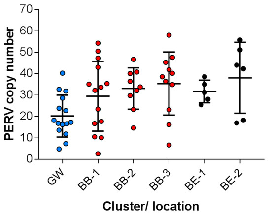 Number of integrated PERV proviruses in genetically different wild boars living in different locations in Berlin and Brandenburg. The animals are sorted by the location and the BAPS cluster. Each point indicates one animal, the median and the standard deviations are shown. Grunewald (GW, blue) (BAPS cluster 1), Berlin Brandenburg (BB-1, -2, -3; red), Berlin East (BE-1, -2, black) (all BAPS cluster 2), see Figure 1.