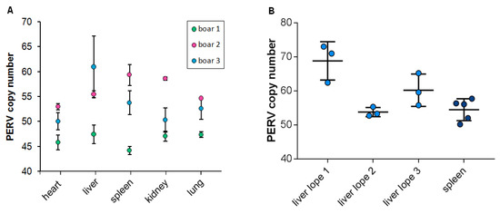 It has been shown that in domestic pigs the PERV copy number is different in different organs of a single animal, indicating that PERVs are active and infect new cells and integrate de novo in somatic cell genomes in living pigs [6,7]. In order to analyze whether the same situation can be observed in wild boars, organs from three different wild boars hunted in the state Brandenburg near Berlin were analyzed. Using ddPCR, the heart, liver, spleen, kidney and lung of three animals were analyzed (Figure 3A). In the case of wild boar 1, the copy number varied between 44 and 47 with a median of 46 and a standard deviation of 1.2 for all tested organs. In the case of wild boar 2, the copy number varied between 53 and 59 with a median of 56 and a standard deviation of 2.4. In the case of wild boar 3, the copy number varied between 50 and 61 with a median of 53.5 and a standard deviation of four. A large difference was observed in the case of the liver, with 46 copies in animal 1 and 61 copies in animal 3. The animal with the largest difference in organs was animal 3, ranging from 49 copies in the heart and 61 copies in the liver. Although the number of analyzed animals was small, a great variability was observed in the liver and spleen of all animals and a low variability was found in the heart, reflecting higher cell proliferation and increased de novo integration of PERV in liver and spleen compared to the heart.