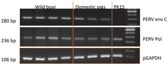 Using a classic PCR, PERV-C was detected in all tested 92 wild boars from all sample locations (Figure 4). The primer binding and the identical size of the amplicons indicate that the sequences in domestic pigs (German landrace) and wild boars analyzed here are identical (Figure 4).