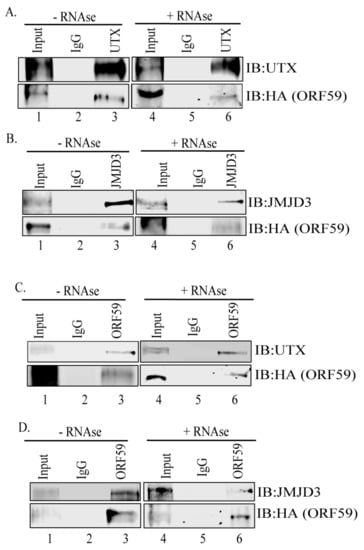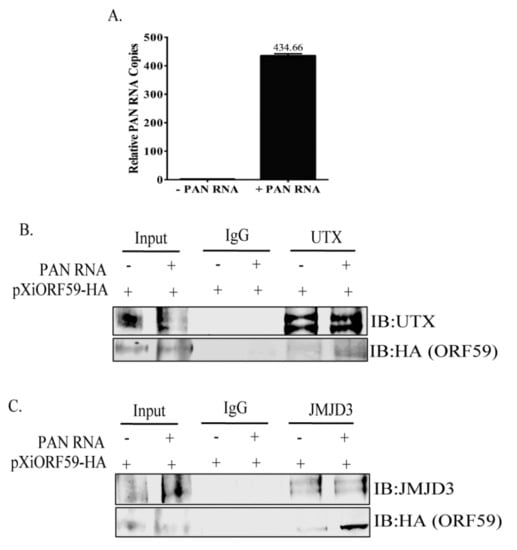 3.3. PAN RNA Mediates ORF59′s Interaction with Demethylases, UTX and JMJD3