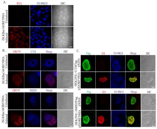 In order to further validate the interactions between ORF59 and UTX or JMJD3, immunofluorescence assays (IFAs) using either 24 h-induced iSLK/BAC16-ORF59HA cells or transfected HEK293 cells (overexpression system) were performed to determine if these proteins localized in the same nuclear compartment in the infected cells during viral reactivation. IFA for RTA expression in iSLK/Bac16-ORF59HA cells plated on UV-treated coverslips, induced for 24 h and stained with anti-RTA (Figure 2A, red signal) indicated efficient lytic reactivation. Analysis of ORF59, UTX or JMJD3 expressions in induced iSLK/Bac16-ORF59HA cells using specific anti-ORF59, anti-UTX, and anti-JMJD3 antibodies indicated ORF59, a nuclear protein, showed a typical nuclear localization pattern (Figure 2B,C, red panel) and colocalized with UTX or JMJD3 (Figure 2B,C, merge panel) at many nuclear foci. This further suggests that ORF59 associates with UTX and JMJD3 in the reactivated cells.