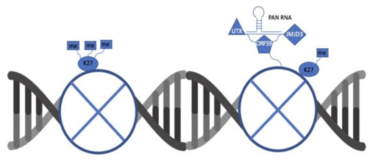 In the past years, investigation of chromatinized KSHV genome identified PAN RNA’s involvement in altering the state of the viral chromatin to promote lytic reactivation []. As a lncRNA, PAN RNA has the ability to regulate gene expression by interacting with chromatin-modifying enzymes, either by direct binding to target specific regions on the genome or by recruiting chromatin modifiers from various sites on the genome [,]. lncRNAs can also incorporate into the chromatin-modifying complex to act as a scaffold for assembly. Previous studies have demonstrated that PAN RNA interacts with multiple viral and cellular factors, including UTX and JMJD3, to remove repressive H3K27me3 histone marks allowing increased viral gene expression during KSHV infection. In addition, PAN RNA promoter is directly bound by RTA, a necessary transcription factor for reactivation []. MLL2, a methyltransferase also binds to PAN RNA and, in contrast to UTX and JMJD3, MLL2 promotes open chromatin formation by enriching H3K4me3 chromatin marks []. PAN RNA can also promote the addition of repressive marks to H3K27me3 by interacting with SUZ12 and EZH2 proteins of the PRC2 complex []. By limiting the levels of repressive marks, PAN RNA maintains higher levels of activating marks allowing for the transition to transcriptionally active chromatin and viral gene transcription. Thus, PAN RNA mediates both positive and negative epigenetic regulation.