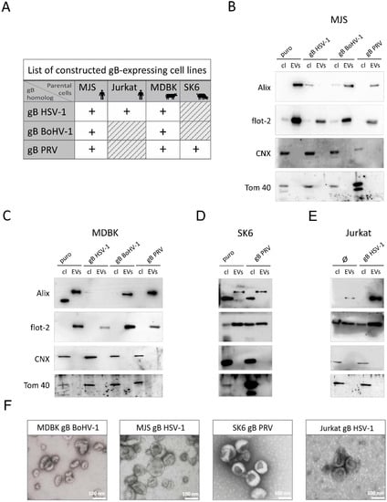 The following are available online at https://www.mdpi.com/1999-4915/12/4/429/s1, Figure S1: Characterization of size exclusion (SEC)-purified extracellular vesicles (EVs) from the constructed gB-expressing stable cell line supernatants, Figure S2: Analysis of gB N-glycosylation, Figure S3: Immunofluorescence-confocal laser scanning microscopy analysis of endosomal/endolysosomal localization of gB homologs in the constructed MJS cell lines, Figure S4: Flow cytometry analysis of endogenous swine MHC II surface expression in porcine alveolar macrophages (PAM), and immunoblotting detection of HSV-1, BoHV-1 or PRV gB in the lysates of constructed retrovirus-transduced and sorted PAM cell lines, Figure S5: OptiPrep gradient-purification of MJS/MDBK EVs or EVs-enriched and virion-enriched fractions from HSV-1, BoHV-1- or PRV-infected MJS or BoHV-1-infected MDBK supernatants. Figure S6: Representative TEM images from the indicated OptiPrep gradient fractions from uninfected or virus-infected MJS or MDBK cell culture supernatants.