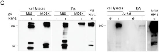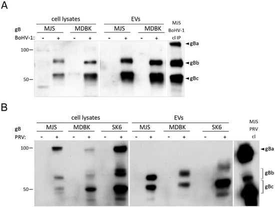 During HSV-1 infection, gB strongly associates with the membranes of endosomal multivesicular bodies (MVB), the compartment of exosome formation [39]. The incorporation of HSV-1 gB to extracellular vesicles in plasmid-transfected human cells has also been well-documented [19,23]. To determine whether EVs targeting is conserved for BoHV-1 and PRV gB, we analyzed our EVs preparations for the presence of the viral glycoprotein. gB is a type I membrane glycoprotein, composed of 933/913 amino acid (aa) residues for BoHV-1 and PRV, respectively. BoHV-1 and the PRV gB precursor (named gBa, with an apparent molecular weight of 130/120 kDa in reducing SDS-PAGE gels) are cleaved at the position of 502/504 by the cellular furin protease into two subunits, which remain linked by disulfide bonding—the N-terminal gBb (74/68 kDa) and the C-terminal-transmembrane gBc subunit (55 kD) [40,41,42]. We chose to use polyclonal anti-gB sera, which were able to recognize all three gB forms. We could easily detect two processed BoHV-1 and PRV gB fragments enriched in EVs from porcine, bovine, and human cells, whereas the precursor gBa was undetectable (Figure 2A,B). This suggested that EVs-incorporated gB were derived from trans-Golgi (TGN)/post-Golgi compartments, where gB processing occurs. The observed weight of gB species differed slightly between the cell lines, which may have depended on the glycosylation pattern, as gB is both N-and O-glycosylated at several positions [43]. HSV-1 gB (904 aa) lacks a furin recognition site [44]. The 110–120 kDa protein could be detected in both cell lysates and the EVs fractions, although its content in the vesicles from MHC II-negative Jurkat cells was low compared to the cell lysates (Figure 2C). HSV-1 gB was present in cell lysates and MJS-derived EVs as a double band, with several lower molecular weight bands recognized by gB-specific antibodies. Depending on the cell type, gB can be produced in two high-molecular-weight forms, which may represent the fully processed glycoprotein and its precursor, with mixed type N-glycans [44]. Lower molecular weight fragments are rarely reported in plasmid-transfected cells, e.g., in mouse melanoma [45].