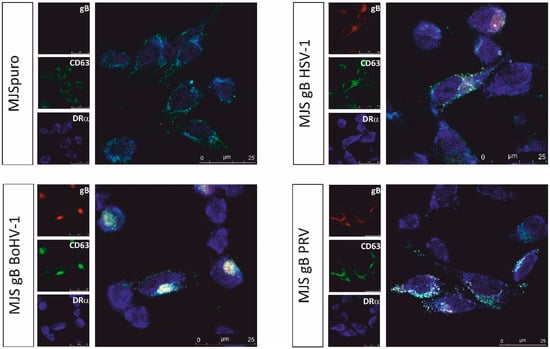 In plasmid-transfected MJS cells, HSV-1 gB co-localizes with MHC class II molecules (or human leukocyte antigen) HLA-DR and CD63 [19]. The CD63 tetraspanin is abundantly present in late endosomes and lysosomes and is enriched on the intraluminal endosomal vesicles, which are secreted as exosomes. An enlargement of gB/CD63/DR-costained vesicles was observed in some cell types, usually upon the overexpression of gB [19,23]. In addition, CD63 stably interacts with MHC II at MVB, including ILV, and controls MHC II expression [46]. Therefore, the CD63-MHC II association may be important for exosomal MHC secretion. This encouraged us to investigate the subcellular localization of gB, CD63, and MHC II (through its HLA-DRα chain) in our stable MJS cell lines using immunofluorescence and confocal laser-scanning microscopy (Figure 3). We could find all three gB homologs co-staining with DRα and CD63 in vesicular structures. Besides, the measurement of the Pearson’s correlation coefficient (Table 1) indicated a slightly more intensive CD63 and DR co-localization in the presence of gB. A threshold of the coefficient equal to 0.5 is regarded as a significant co-localization, and in the presence of HSV-1, BoHV-1 and PRV gB, the coefficient increased, on average, from 0.64 to 0.71, 0.76, and 0.74, respectively. We did not observe a significant enlargement of CD63-positive structures, which resembles low-level HSV-1 gB-expressing MJS cells, described by Temme et al. Only the BoHV-1 gB could be detected in large amounts and also perinuclearly in a compartment resembling Golgi.