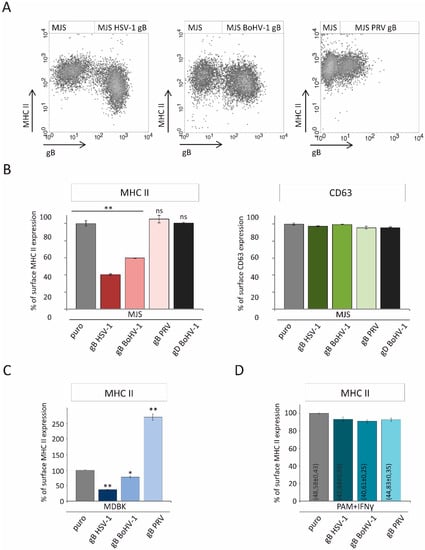 The effect of alphaherpesvirus gB expression on the surface levels of human, bovine, and porcine MHC class II. (A) Surface expression of HLA-DR was assessed by flow cytometry on gB-retrovirus transduced unsorted MJS cells (a nerve growth factor receptor (NGFR) marker reflecting gB expression is plotted against MHC II). (B) Analysis of the relative HLA-DR levels on the surface of gB-expressing sorted cells. Surface CD63 expression was analyzed as a control. The effect of the BoHV-1-encoded gD on surface MHC II and CD63 was assessed for comparison. The mean fluorescence intensity of MHC II/CD63 on MJSpuro control cells was set at 100%. The analysis was performed in triplicate. The statistical significance of differences between MJSpuro and MJS gB/gD cell lines was estimated by t-test; ** p ≤ 0.001; ns-not statistically significant. (C) Surface expression of bovine MHC II was analyzed by flow cytometry on gB-retrovirus transduced sorted MDBK cells and MDBKpuro control cells. The mean fluorescence intensity of MHC II in MDBKpuro control cells was set as 100%. The analysis was performed in triplicate. The statistical significance of differences between MDBKpuro and MDBK gB cell lines was estimated by t-test; ** p ≤ 0.001, * p ≤ 0.01. (D) Surface expression of porcine MHC II was analyzed by flow cytometry on gB-retrovirus transduced sorted porcine alveolar macrophage (PAM) cells and PAMpuro control cells. The cells were incubated for 36 h with 0.1 mg mL−1 of recombinant swine interferon (IFN)-γ. The mean percentage of MHC II-expressing cells (±standard deviation) is provided on each bar. The mean fluorescence intensity of MHC II in PAMpuro control cells was set as 100%. The analysis was performed in triplicate. The differences between PAMpuro and PAM gB cell lines were found statistically insignificant.