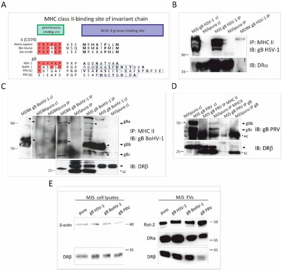 Analysis of interaction between MHC II and HSV-1, BoHV-1 or PRV gB, and the effect of alphaherpesvirus gB on MHC II incorporation in EVs. (A) Comparison of amino acid sequences representing potential HSV-1, BoHV-1, and PRV gB and MHC II biding site. HSV-1 gB contains an allotypic HLA-DR-binding region homologous to the human invariant chain (Ii, CD74), consisting of the promiscuous and the MHC II groove-binding sites. Whereas bovine and porcine Ii sequences are highly conserved, their corresponding regions in BoHV-1 and PRV gB (two candidate sequences) are variable. Amino acids (aa) that are identical to those in human Ii are in red frames. Boxes highlight predicted MHC II peptides. The groove-binding positions are in bold. (B) Complex formation between HSV-1 gB and HLA-DR or bovine MHC II from cell lysates was evaluated by co-immunoprecipitation (IP) using anti-MHC II mAb. Immunoprecipitated proteins were separated by SDS-PAGE and detected by immunoblotting (IB) with anti-gB or anti-DRα antibodies (for human cells). (C) and (D) Co-IP with anti HLA-DR or bovine MHC II (in C) mAb from MJS BoHV-1/PRV gB or MDBK BoHV-1 gB lysates. gB or DRβ were detected in SDS-PAGE-separated complexes by IB. Size markers are in kilodaltons. *LC: light chain of antibodies; HC: heavy chain of antibodies. Arrows indicate gB species. (E) Detection of DRα, DRβ and flotillin-2 (flot-2) as an EVs marker in SEC-purified EVs by IB. β-actin and DRβ were detected in cell lysates for comparison. Size markers are in kilodaltons.