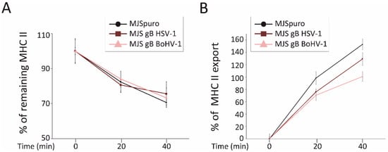 It has been postulated that HLA-DR downregulation in the presence of HSV-1 gB results from the interrupted transport route of MHC II complexes to the plasma membrane, rather than from their accelerated internalization by endocytosis [19]. Therefore, using a flow cytometry-based assay, we next assessed the kinetics of HLA-DR internalization and its appearance at the surface of MJS BoHV-1 gB cells and compared these processes with MJS puro or MJS HSV-1 gB cells (Figure 6). In both gB-expressing cell lines, we found a very similar reduction in MHC II within 20 or 40 min at 37 °C, which was statistically comparable to the control cells. These data confirm that both gB orthologs do not significantly alter the rate of MHC II internalization.
