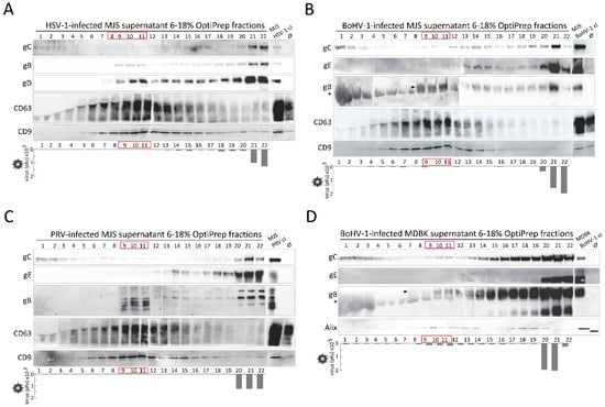 With a view to determining the biological significance of gB incorporation in the EVs in our stable cell lines, we tested whether gB can also be transferred to the vesicles during viral infection. An efficient and reliable separation of EVs from virus particles can, however, be challenging, as vesicles and virions demonstrate similar biophysical properties, such as size and sedimentation [49]. We chose to follow a recently reported EVs separation protocol involving ultracentrifugation in a slowly descending discontinuous iodixanol (OptiPrep)/sucrose gradient, developed for HSV-1 by Deschamps and Kalamvoki [4]. As EVs need some time (usually 24–72 h) to accumulate, we infected MJS cells with HSV-1, BoHV-1 or PRV or MDBK with BoHV-1 at low multiplicities of infection (moi): 0.1 for HSV-1 in MJS and BoHV-1 in MDBK or 0.5 for BoHV-1 and PRV in MJS. The kinetics of BoHV-1 and PRV infection in MJS are slower than in species-specific cells, although the progeny virus can be produced ([35] and our unpublished data [50]). The infected cell culture supernatants were collected 50 h post-infection; cell debris, nuclei and larger vesicles were separated by filtration through 0.45-μm-pore size filters. Uninfected MJS/MDBK cell culture supernatants were analyzed as controls. First, equal volume samples (40 µL) of twenty-two gradient fractions (500 μL, with a 1.5 mL top fraction) were analyzed by immunoblotting for the presence of CD63, CD9 or Alix (for MDBK) and the viral glycoproteins C (gC)), D (gD, for HSV-1), E (gE, for BoHV-1 and PRV), and gB (Figure 7 and Supplementary Figure S5). Infectious viral particles were measured in the fractions by plaque assays (Figure 7).