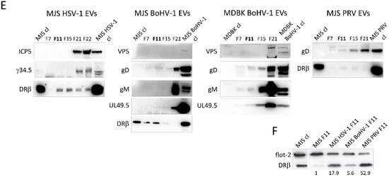 We analyzed the protein content of the chosen fractions more thoroughly using a collection of virus protein-specific antibodies available in our laboratory. We checked, by immunoblotting, whether F11, F15, and F21 (for HSV-1, we analyzed both bottom fractions F21-F22) contained gD (for BoHV-1 and PRV), BoHV-1 gM, capsid protein VP5/ICP5 (for HSV-1 and BoHV-1), HSV-1 neurovirulence factor and protein kinase R inhibitor γ34.5, and BoHV-1 immunomodulatory protein UL49.5 (Figure 7E). Fraction F7 (which may contain protein aggregates and small vesicles) was used as a control. In addition, we blotted the infected MJS samples for HLA-DRβ, as MHC II molecules are also EVs markers. Cell lysates and virus-infected cell lysates were analyzed as controls. BoHV-1 and PRV gD was present in fractions F11–F15, resembling, in this respect, HSV-1 gD. Low levels of BoHV-1 gM and UL49.5 were also localized in the EVs fractions from the infected MDBK gradient, but we could not detect HSV-1 γ34.5 or the HSV-1/BoHV-1 capsid protein there. The amount of VP5 in the BoHV-1 material was generally low, which indicates that low amounts of virus particles were released and also makes the detection of other viral proteins in EVs more reliable (those not resulting from contamination with virions). In the case of DRβ, it was accumulated in the EVs fractions, in much lower amounts in the HSV-1 virion fraction, and it was undetectable in BoHV-1 and PRV-infected MJS-derived F21.