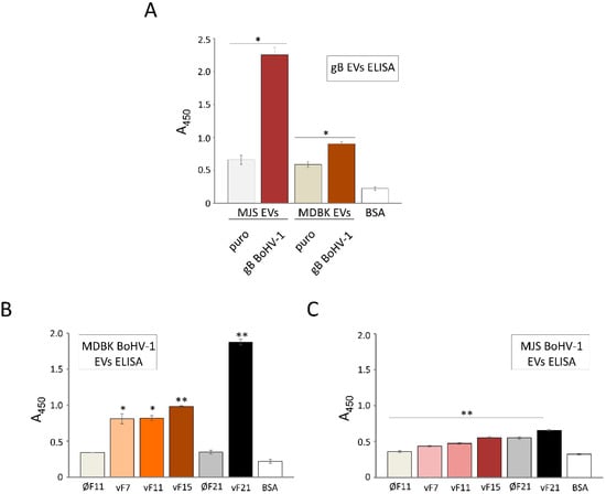 To investigate a potential functional consequence of gB incorporation in EVs, we tested whether gB-positive vesicles can bind virus-specific antibodies in ELISA. A commercially available whole BoHV-1 virus-immunized polyclonal serum was used for the detection of BoHV-1 gB in SEC-isolated EVs (unlysed) from stable MJS or MDBK cell culture supernatants (Figure 8A) or from purified OptiPrep fractions, designated here as vF7, vF11 and vF15 (EVs-enriched) or v21 (virus-enriched), from BoHV-1-infected MDBK (Figure 8B) or MJS cells (Figure 8C). EVs from the control MJS/MDBKpuro cells or corresponding OptiPrep fractions from uninfected cells, designated here as ØF11 and ØF21, were used to establish the specificity of binding.
