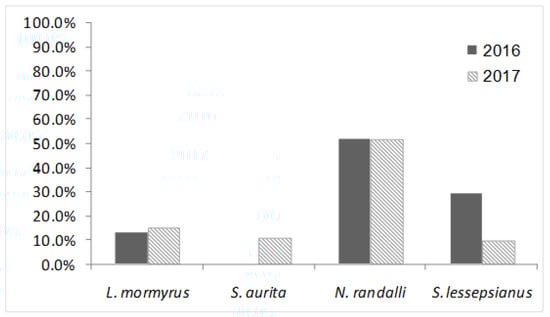 Percentage of NNV positive in the sampled wild fish species. For each species, the results in 2016 and 2017 are presented. No significant difference was found between the sampled years per each species (Chi-Square test of independence, p > 0.05).