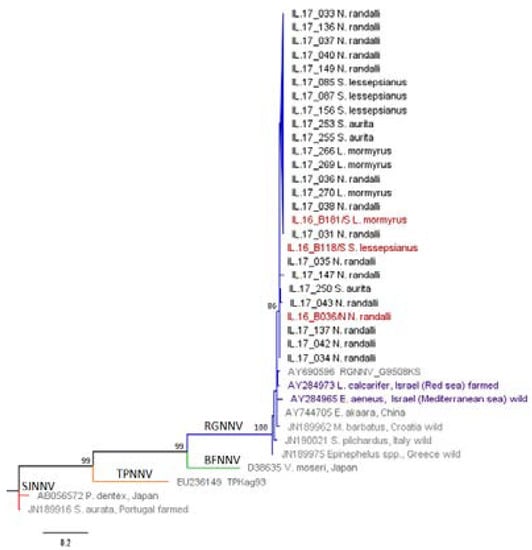 The phylogenetic analysis of NNV across the four wild fish species from the Mediterranean Levantine Basin showed that all belonged to the RGNNV genotype. These results are in agreement with previous studies that reported the presence of RGNNV genotype only and revealed no reassortant genotypes in wild species [,,,,].