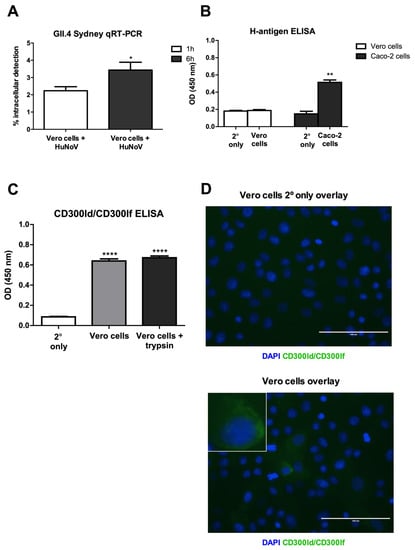 (A) GII.4 HuNoV detection by qRT-PCR. qRT-PCR analysis of RNA extracted from HuNoV-infected Vero cells. Data represent n = 3 + SEM. * p < 0.05. (B) Vero cells do not express detectable H-antigen. An indirect ELISA was used to detect the H-antigen on the cell surface of Vero cells and Caco-2 cells. No signal was observed for secondary only antibody controls (2°). Data represent n = 4 (Vero cells H-antigen ELISA) or n = 1 (Caco-2 cell H-antigen ELISA) + SEM. ** p < 0.01. (C) Vero cells express CD300ld/CD300lf. Anti-CD300lf (ectodomain) indirect ELISA of Vero cells following 24-h treatment ± 8.8 BAEE of trypsin. No signal was observed for secondary only antibody controls (2°). Data represent n = 3 + SEM. **** p < 0.0001. (D) CD300ld/CD300lf expression on Vero cells by immunofluorescence. A representative image is shown at 40× magnification from n = 3 biological replicates. CD300ld/CD300lf-associated fluorescence was not observed for secondary antibody only (2°) treated cells. The inset shows a CD300ld/CD300lf-expressing Vero cell.