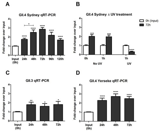 (A) Vero cells are permissive for GII.4 Sydney HuNoV. HuNoV levels were examined over a 5-day time-course and peaked between 48–72 hpi by qRT-PCR. Data represent n = 3 + SEM. * p < 0.05 and **** p < 0.0001. (B) UV inhibits HuNoV replication. 1 h treatment with UV light inactivated HuNoV reducing replication at 72 hpi as measured by qRT-PCR. Data represent n = 3 + SEM. *** p < 0.001 and **** p < 0.0001. Vero cells are permissive for GII.3 (C) and GII.4 Yerseke (D) HuNoVs. qRT-PCR analysis over a 3-day time-course. Data represent n = 3 + SEM. * p < 0.05, ** p < 0.01, and **** p < 0.0001.
