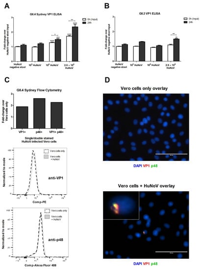 Detection of GII.4 Sydney (A) and GII.3 (B) HuNoV VP1 by ELISA. OD (450 nm) were measured and fold-changes normalized to HuNoV negative stool input values were graphed. Data represent n = 3 (A) or n = 1 (B) + SEM. * p < 0.05, ** p < 0.01, *** p < 0.001, and **** p < 0.0001. (C) Increased VP1 and p48 staining frequency in HuNoV-infected Vero cells. Detection of single-positive (VP1+ or p48+) and double-positive (VP1+ p48+) Vero cell populations following HuNoV inoculation. Histograms generated following fluorescent bead compensation with the cell counts normalized to the mode. Data represent n = 1 from 5 biological replicates. (D) Visualization of GII.4 Sydney VP1 and p48 proteins by immunofluorescence assay. Representative image is shown at 40× magnification from n = 3 biological replicates. VP1- or p48-associated fluorescence were not observed for secondary antibody only (2°) treated cells. The inset shows a HuNoV-infected Vero cell.