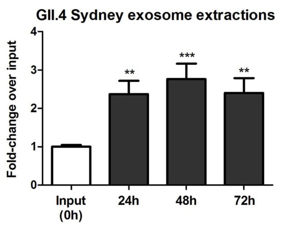 Vero cells are permissive for exosome-associated GII.4 Sydney HuNoV. qRT-PCR analysis of a 3-day time-course. Data represent n = 3 + SEM. ** p < 0.01 and *** p < 0.001.