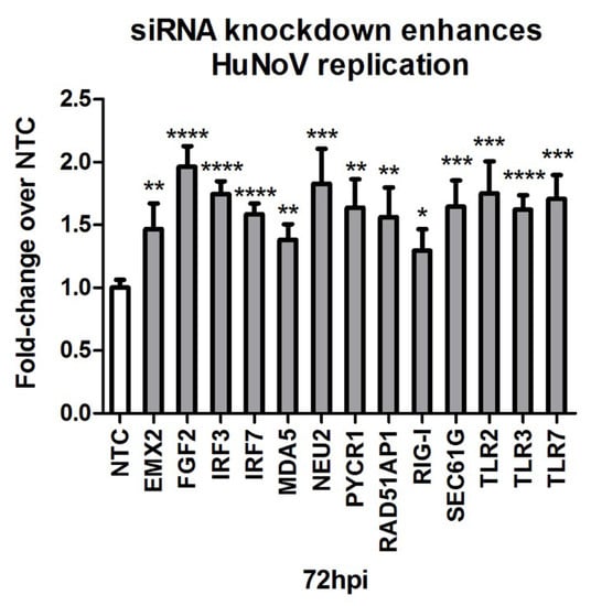 The knockdown of antiviral host gene expression increases GII.4 Sydney HuNoV replication. Treatment with pooled gene-specific siRNAs [50 nM] 48 h before infection resulted in substantial increases in HuNoV titers 72 hpi by qRT-PCR compared to non-targeting control (NTC) siRNA treated cells. Data represent n = 3 + SEM. * p < 0.05, ** p < 0.01, *** p < 0.001, and **** p < 0.0001.