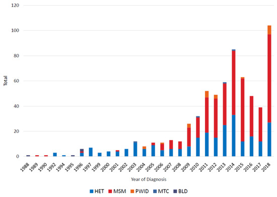 Noncumulative HIV-1 subtype B diagnoses in Bulgaria from 1988 to 2018 by transmission category. HET, heterosexual; MSM, men who have sex with men; PWID, persons who inject drugs; MTC, mother-to-child; BLD, blood transfusion.