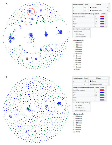 Inference of subtype B clusters in Bulgaria using MicrobeTrace. (A) A total of 52 clusters were identified using a genetic distance of 1.5% compared to (B) 34 clusters at a genetic distance of 0.5%. Gender is indicated by circles (male) and addition signs (female). Transmission category is indicated with color (red, blood transfusion; blue, men who have sex with men (MSM); green, heterosexual (HET); brown, persons who inject drugs (PWID); purple, mother-to-child (MTC). One person reporting MSM and PWID risks was included in the MSM group. Cluster totals by node (members) and total number of links in the transmission network is provided. Large clusters with most of the members have HIV infection with drug resistance mutations at the 1.5% threshold are circled in red (nonnucleoside reverse transcriptase inhibitors) and purple (protease inhibitors).